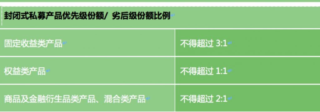 《指导意见》对开放式公募、封闭式公募、分级私募和其他私募资管产品,分别设定了140%、200%、140% 和200% 的负债比例(总资产/ 净资产)上限。禁止公募产品和开放式私募产品进行份额分级。在可以分级的封闭式私募产品中,固定收益类产品的分级比例(优先级份额/ 劣后级份额)不得超过3:1,权益类产品不得超过1:1,商品及金融衍生品类产品、混合类产品均不得超过2:1。