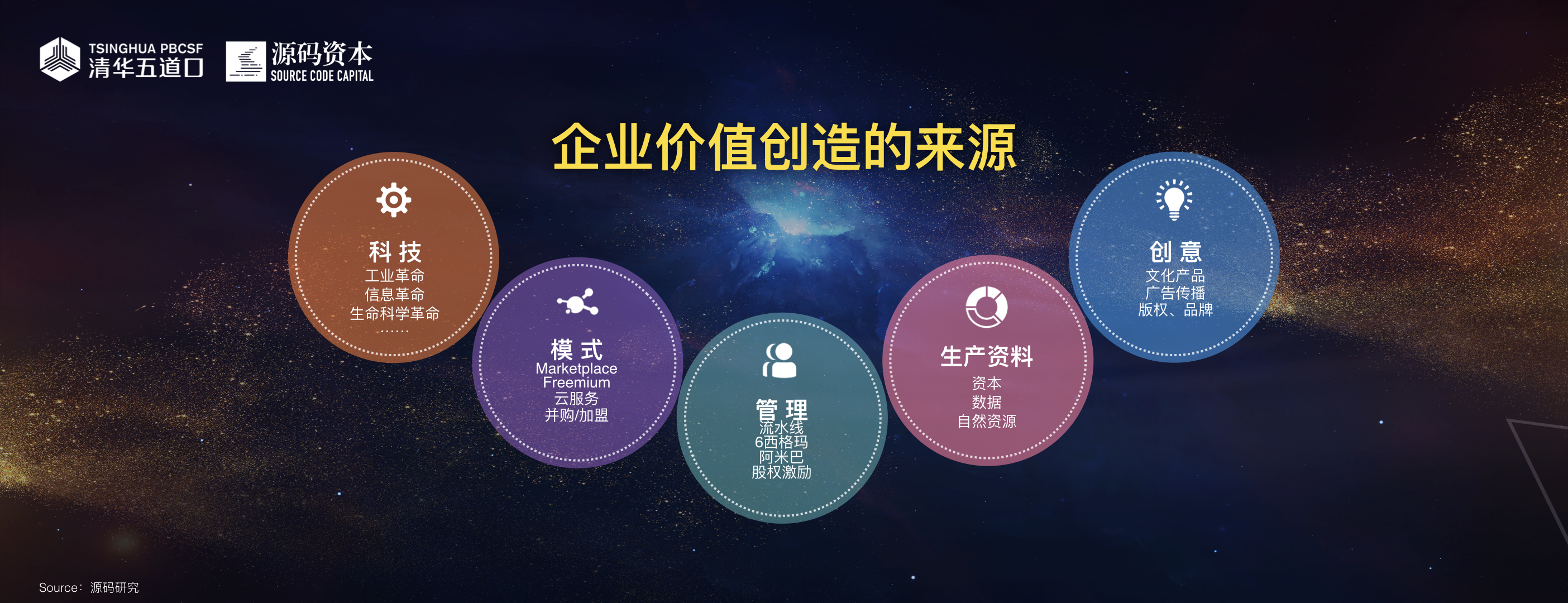 首先我想先从抽象的宏观层面来研究企业价值创造的根源。我们列了几个基本要素,有科技的因素、有模式的因素、有管理的因素等,在过去几十年甚至可以倒推到几百年前,在工业革命、信息革命时代,最核心的因素是科技、模式和管理,这些可能是驱动企业创造价值最重要的来源。