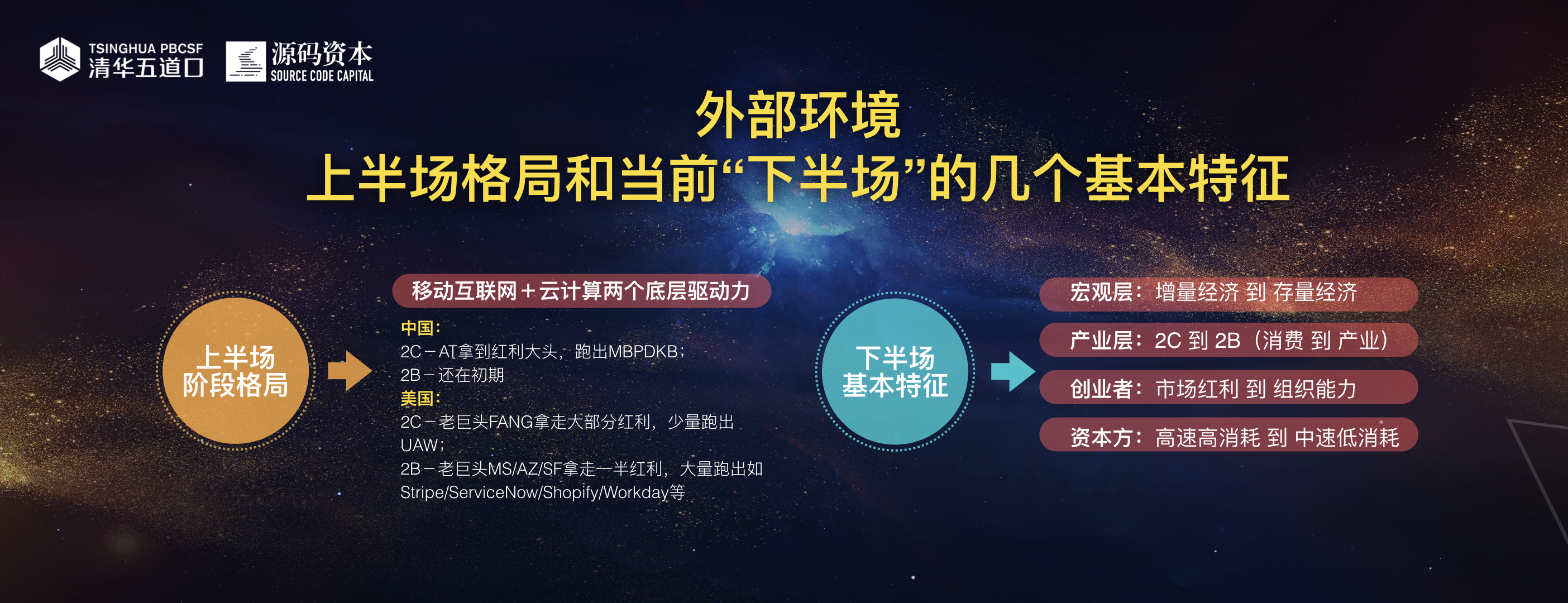 在下半场,在宏观层、产业层、创业者层、资本层有哪些基本特征?宏观层面就是从增量经济到存量经济;产业层2C为主到2C/2B均衡甚至反超;创业者原来注重市场红利洞察和捕捉,现在要更加注重组织能力;资本层原来很关注高增长高消耗的一些商业模式,现在会更关注中速但是比较低消耗的一些商业模式。