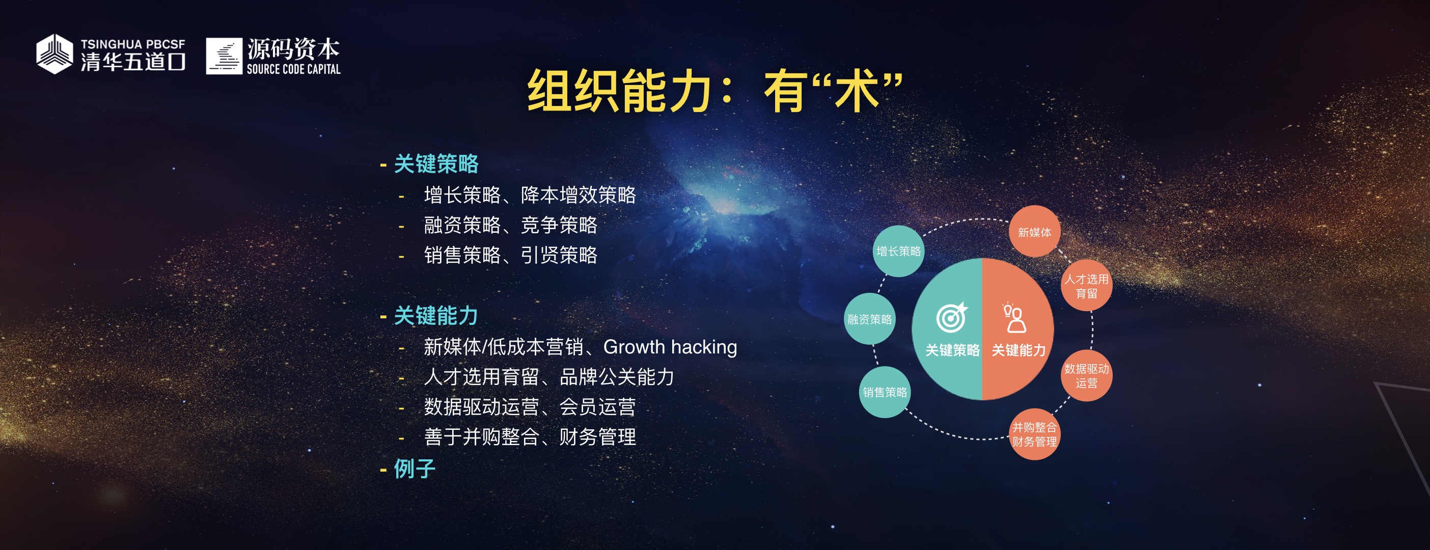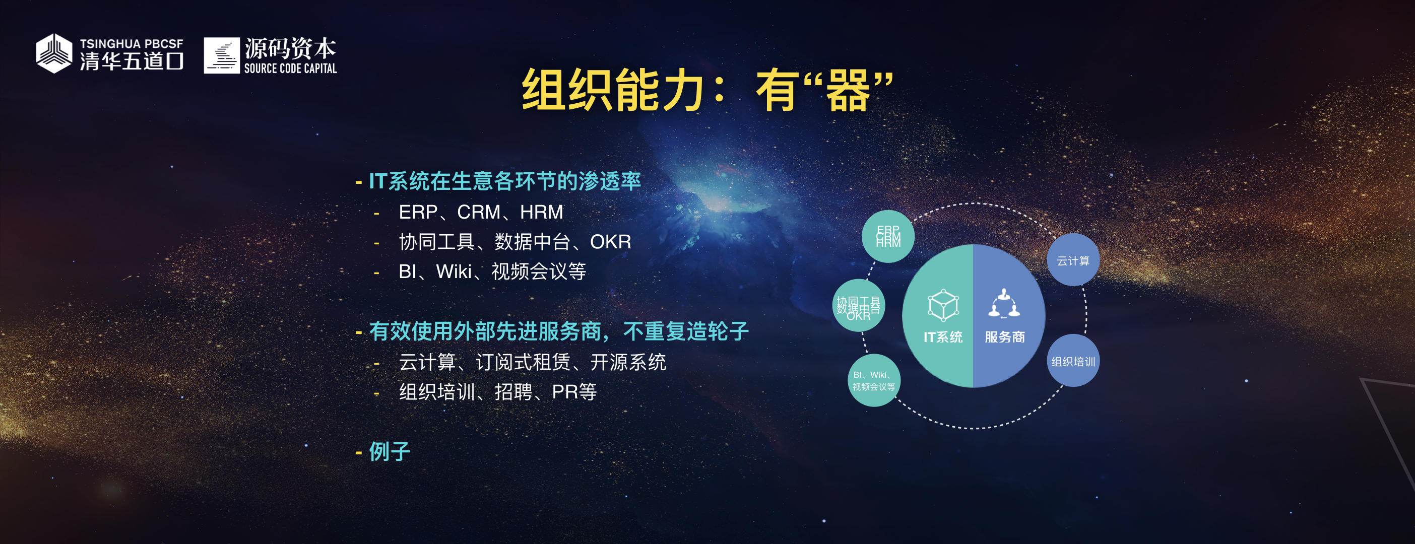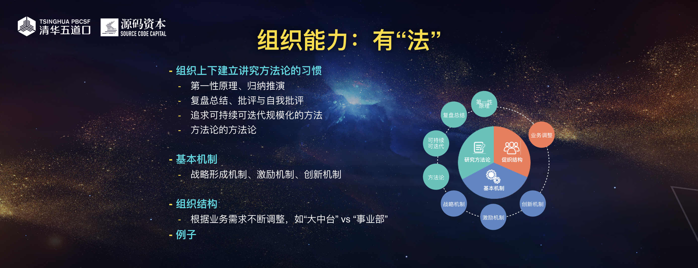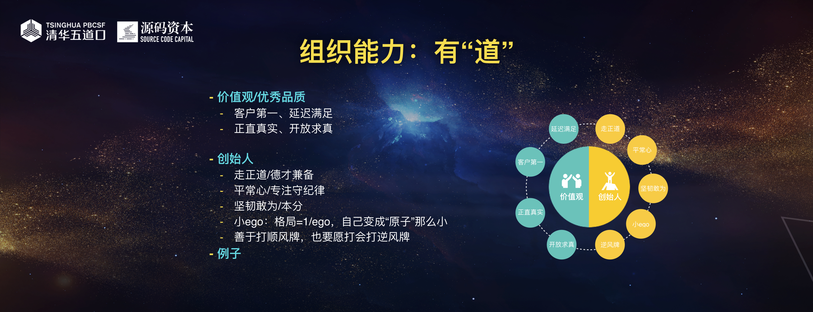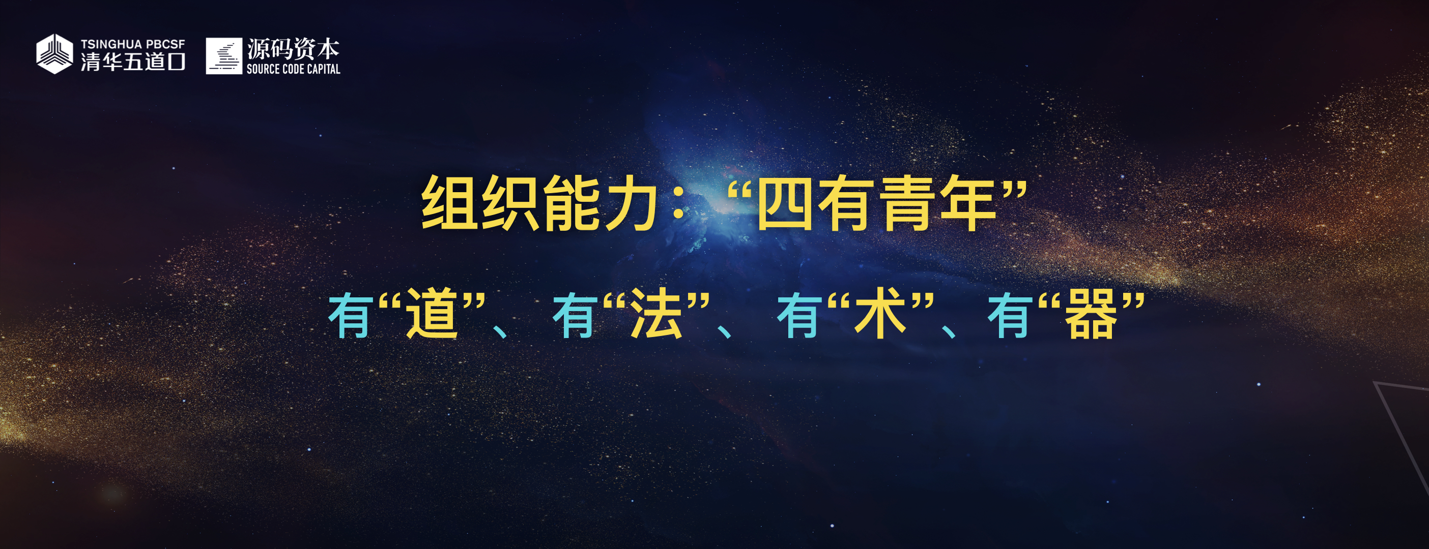 下半场的好公司能够脱颖而出的重要原因之一就是在人和,即组织能力。我们自己总结在组织能力这一块要做一个“四有青年”:有道、有法、有术、有器。