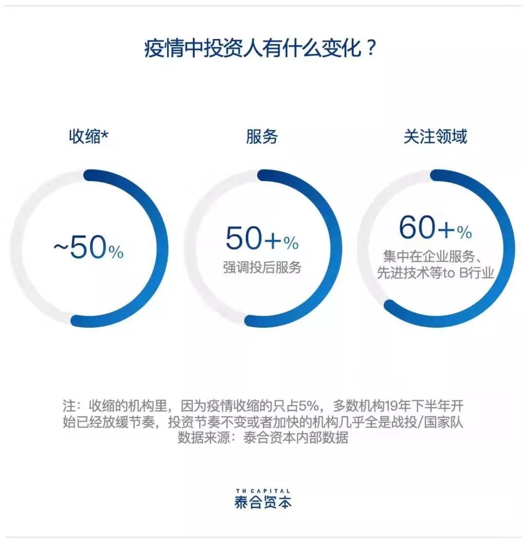 我们针对经常合作的40家投资机构做了一个简单调研。疫情对投资者的情绪有什么变化?约50%的投资人表示将在2019年基础上继续保持收缩策略,再追问,发现其中因为疫情收缩的大概只占5%左右,主要是出差不方便影响看项目、DD等。