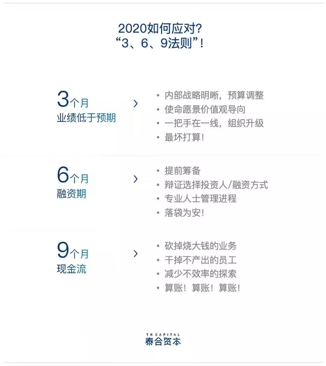 不管是疫情带来的变化,还是大环境变化,应该怎么应对?我们总结出了“369法则”——至少假设三个月业绩是低于预期的,至少留足6个月的融资期,至少要留足9个月的现金流。创业者一定要做最坏的打算,争取最好的结果。