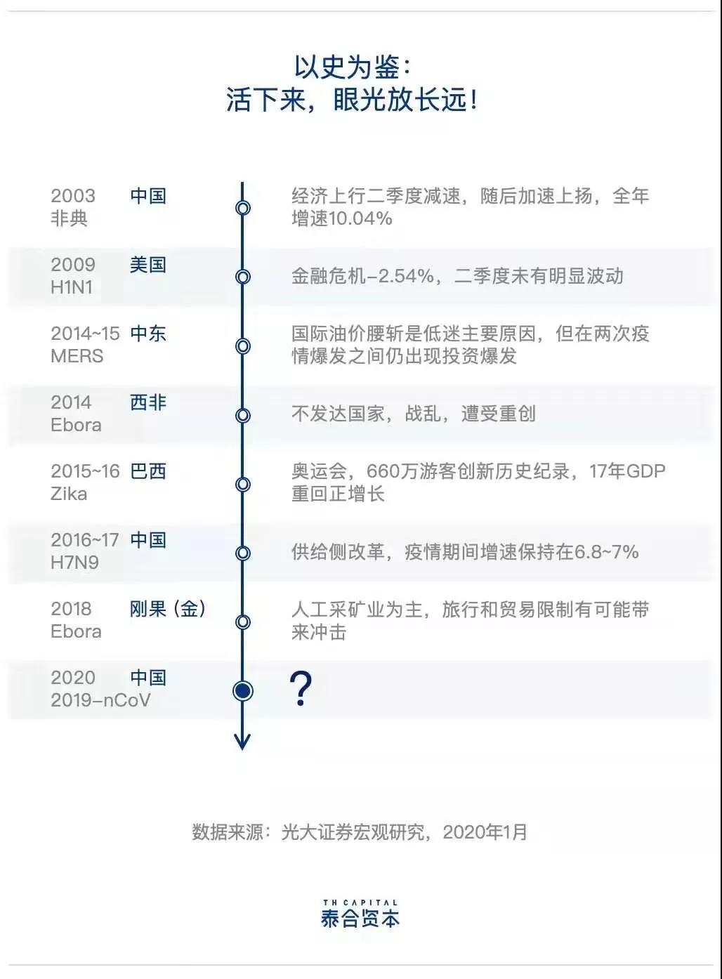无论中国当年的非典,还是美国当年的H1N1,亦或是中东的呼吸综合征,甚至是巴西的寨卡病毒,开始都对区域经济发展产生了大约1~2个月的影响,实际上回调也是非常迅速,有一点非常重要,那就是在一个非常时期,怎样更好地保持自己的健康度——先活下来,再从更长远的角度看,如何能够重新成长出来、活得更好。追溯历史,我们看到的都是比较让人有信心的案例,大家不必过度恐慌。长期看多中国经济,也是我们的基本判断,否则我们没必要在这里创业和投资。