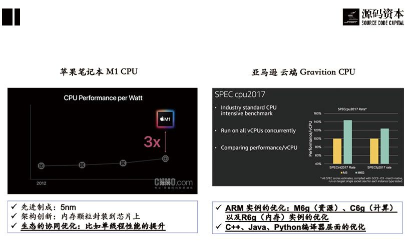 第二个思路是针对应用场景做软硬件一体的优化方案,从而最大程度上发挥出硬件的潜力。典型的案例有苹果新发布的笔记本电脑,和亚马逊AWS的服务器。