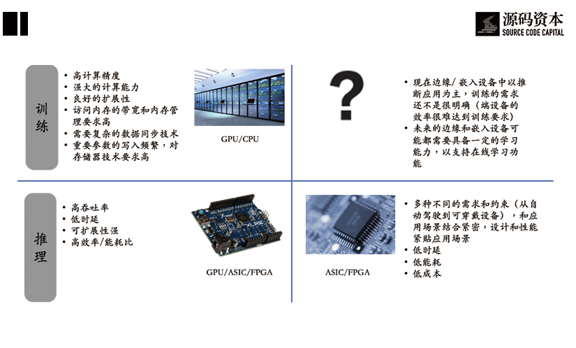 先看AI芯片,目前主流的AI算法主要是深度学习算法, 其底层的算子涉及到大量的并行计算。在不同的场景下,对于AI芯片又有不同的要求: