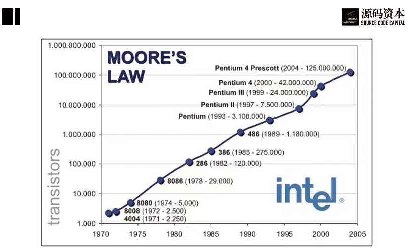 著名的“摩尔定律”由此诞生,它的准确表述是:当价格不变时,集成电路上可容纳的晶体管数目,约每隔18个月便会增加一倍,性能也将提升一倍。直观来讲,就是每18个月,同样价钱可以买到的算力翻两番。