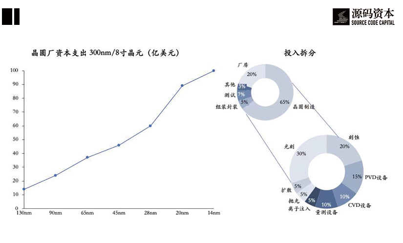 而先进制程的进步,背后是晶圆厂的不断投入,需要投入大量的资金建造厂房、购买最先进的工艺设备。以量产14nm制程、300nm大小的晶圆厂为例,总体的投资在100亿美元左右,其中65%的资金需要投入到与晶圆制造相关的设备上,比如光刻机、刻蚀设备、物理气体沉积(PVD)设备、化学气体沉积(CVD)设备等与晶圆制造相关的设备。