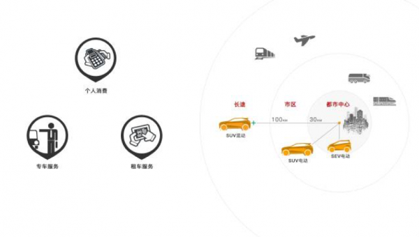 然后我们的SUV采用增程动力的方式,我们消费者在市区里可以纯电动行驶,足以满足他的使用,纯电动部分可以跑到150-200公里,当他需要跑长途的时候,我们增程部分可以满足400到500公里,所以累计的历程可以达到600到700公里,变成一个人人可以拥有的电动车。