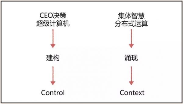 第二种,有更多的人参与决策,让更多的想法自下往上涌现出来,而不是一个从上到下的战略分解,这个过程中需要更多人基于上下文Context做出判断,而不是根据指令来执行。