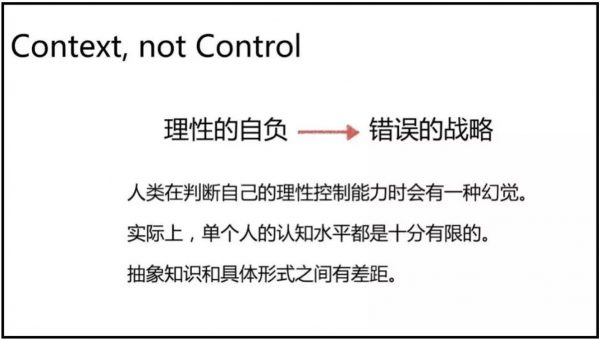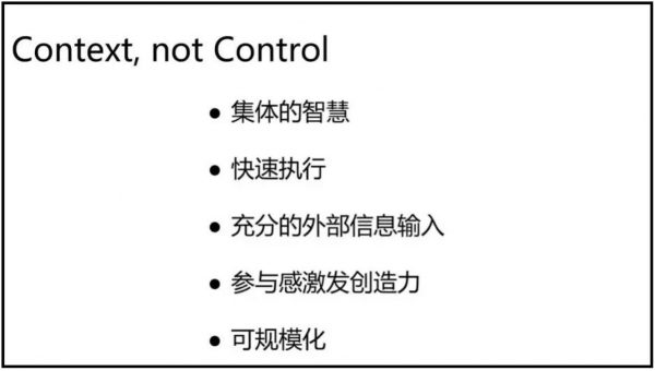 具体来讲,什么是Context,什么是Control。Context是指决策所需要的信息集合,包括原理是什么,市场环境如何,整个行业格局如何,优先级是什么,需要做到什么程度,以及业务数据和财务数据等等。Control则包括了委员会、指令、分解和汇总、流程、审批等等。为什么我们倾向于“Context, not Control”呢?