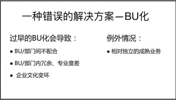 针对公司变大后,会出现的这些问题,有一种错误的解决方案——过早BU化。但这种方案会导致几个问题: