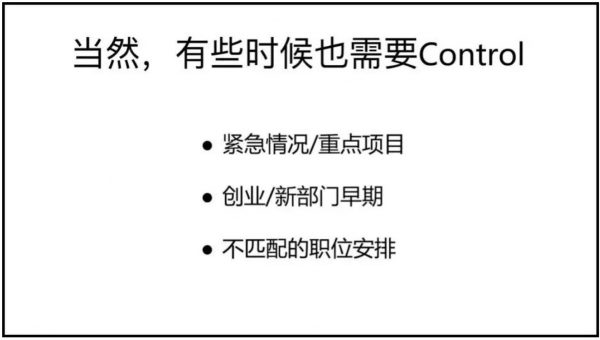 第二、创新业务和新部门的早期。如果一个部门新设立,或者一个新高管上任,还没有跟公司磨合好,这个时候需要Control。创新业务早期,需要更多支持配备资源的时候,也需要CEO的统一协调,主导进展。