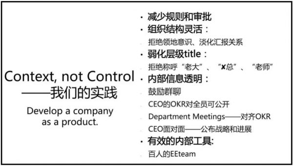 第二、“充分Context,少量Control”的管理模式。每个人有他需要扮演的角色,掌握所有的上下文信息,做出业务决策。在必要的时候,做出少量的干预。有了以上两点,就能保证组织内的交易成本最小,并且做出高质量的决策。基于这个理念,在我们公司,遇到问题的时候,往往习惯先问Context是不是不够充分,而不是增加Control。